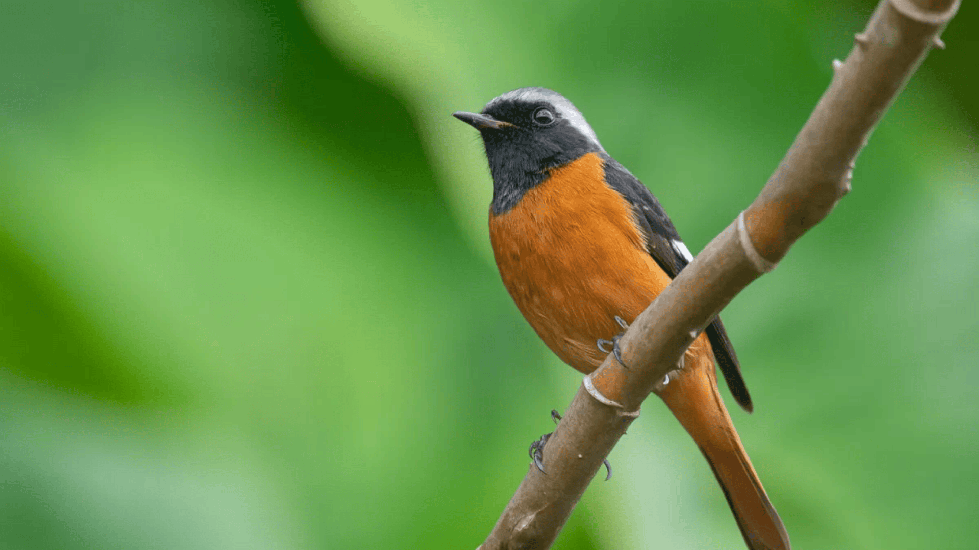 A small passerine bird, the male has a striking orange belly and black face with a white wing patch. Females are more subdued in color.