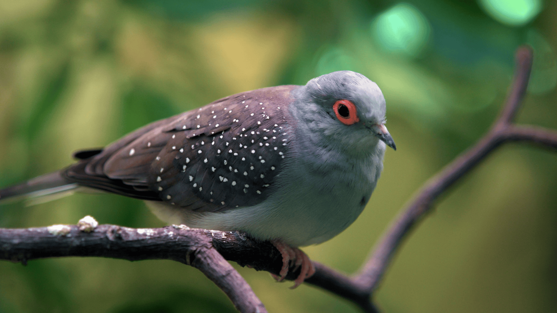 A small dove about 19–21 cm long with a grayish body and distinctive white spots on its wings resembling diamonds.