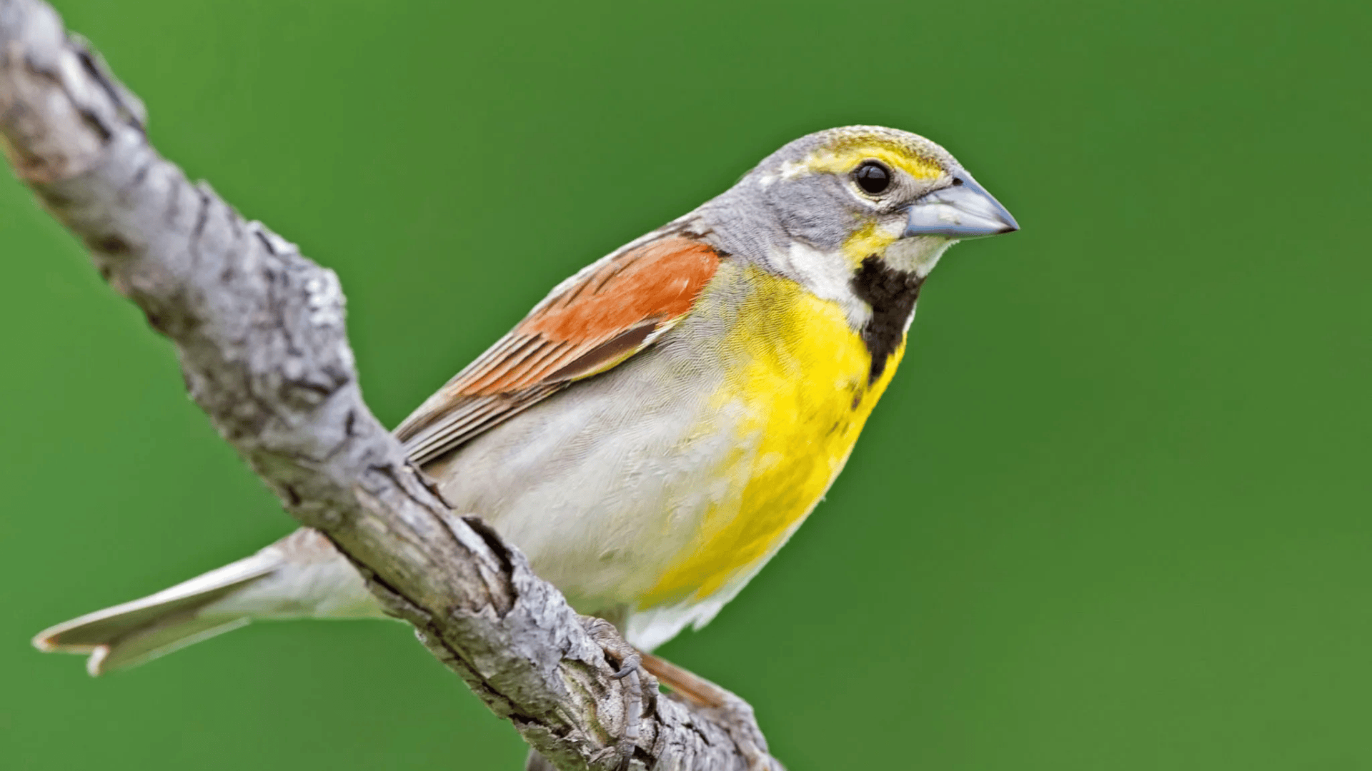 This sparrow-like bird has a thick bill, yellow chest, and black “bib.” Males are brightly marked, while females are browner.