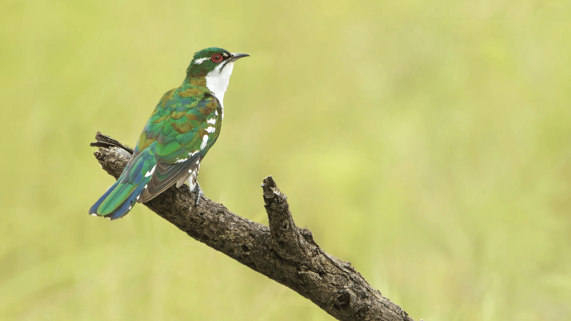 This small cuckoo is about 18–20 cm long, with glossy green upperparts and bold white underparts. Males have a red eye-ring and are more colorful than females.