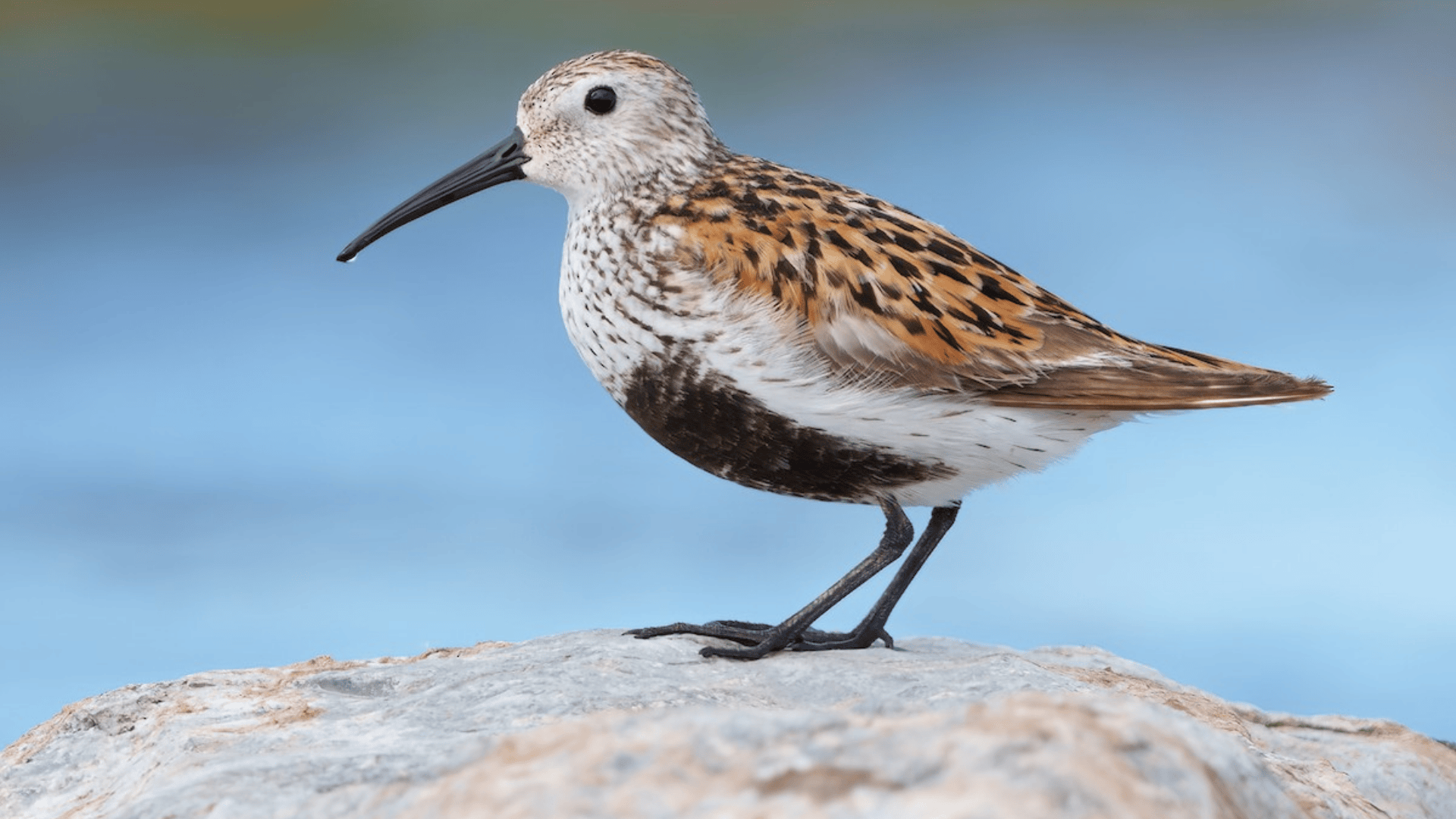 Dunlins migrate in large flocks, forming synchronized patterns in flight. Their black belly patch is only visible in the summer.