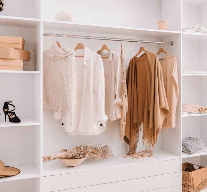 Before putting anything back, clean the closet itself. Wipe down the shelves, vacuum the floor, and clear the dust from the corners. The emptiness won’t last, but that breath of fresh air matters. It’s a reset for the space and for your mindset. Hang your “keep” items thoughtfully. Use matching hangers if you have them. Group similar pieces together — tops with tops, pants with pants. Give the clothes you love a little breathing room. The goal is a closet that reflects the person you are today, not a past version or an imaginary one.
