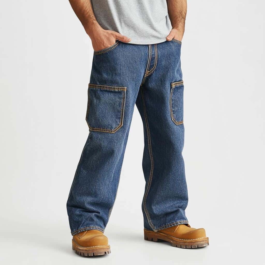 - Fit: Loose-fitting, durable jeans with extra pockets and loops for tools, designed for utility and comfort.