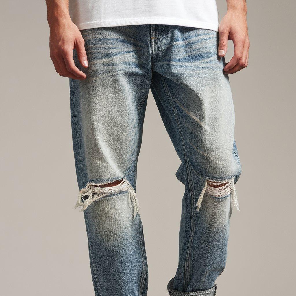 - Fit: Similar to distressed jeans, but with larger, more pronounced tears or rips in the fabric.