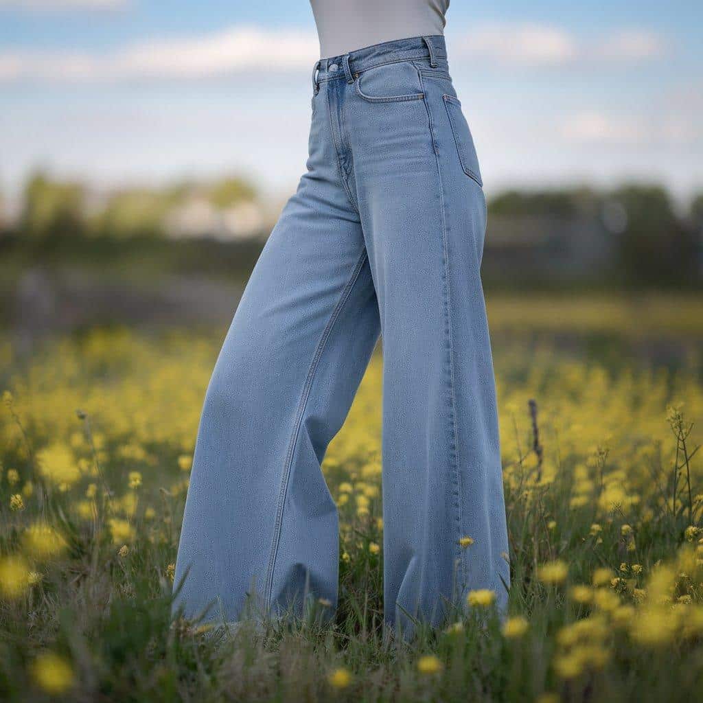 - Fit: Wide-leg jeans with an exaggerated length that gathers or “puddles” on the ground.