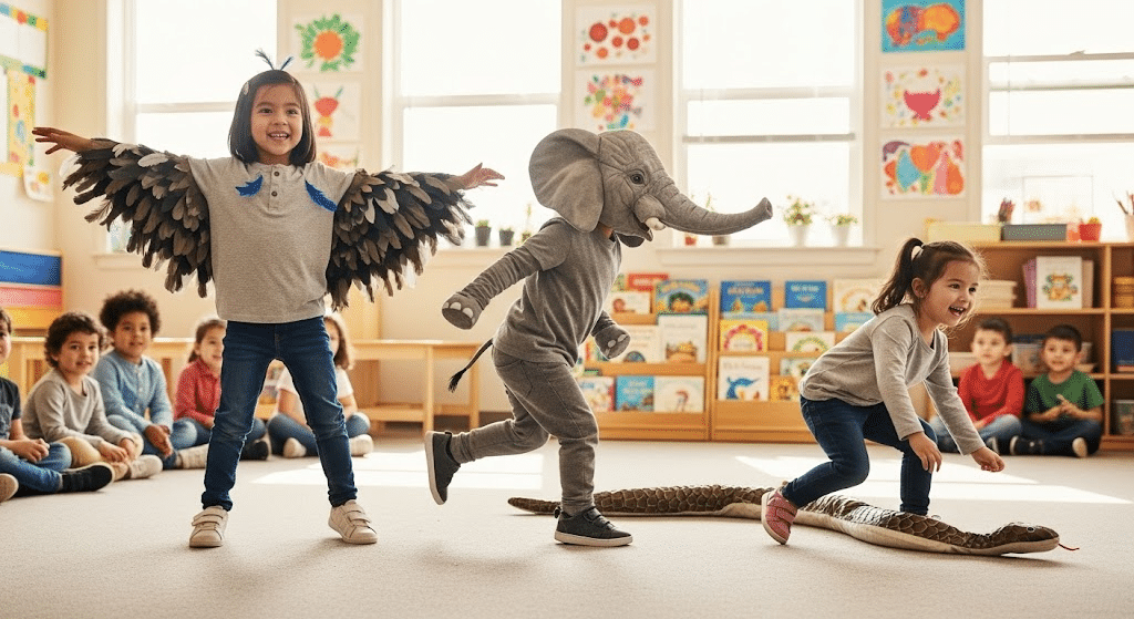 Kids love pretending to be animals, so make movement fun by crawling like bears, walking like crabs, or hopping like frogs.