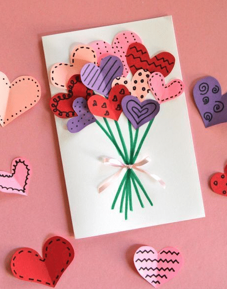 Use felt pen tips to decorate the hearts. Use green paper to cut thin stems for the flowers. To make the card use a fully colored sheet. Fold and paste the thin green stem cutouts on one side. Then stick the heart-shaped cutouts. Complete the card by writing the text inside. And a pretty Valentine’s Day card is ready, handcrafted by your kids at home.