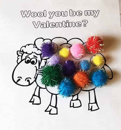 This idea starts by printing a sheep on a sheet. The other supplies that you will need for this craftwork are glue, multiple pom poms, and a pen for writing cute messages for friends. In this Valentine’s Card, kids either use the printed sheep or draw their own using pens and pencils.