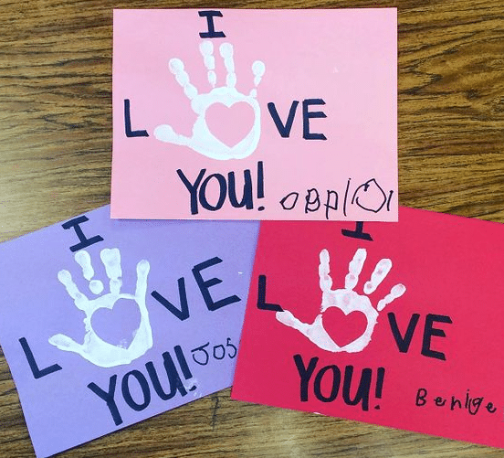 In this particular case, first, ask the kids to write ‘I Love You’ on a sheet of paper. The letter ‘L’ can be left vacant as this is where the handprint will go. Next, get your kids to soak their palms, right or left, in the colored water and leave their handprint on the spot to complete the word ‘LOVE.’ The kids can then sign up their names on the card. This is a perfect Valentine’s Day card for their friends and cousins.