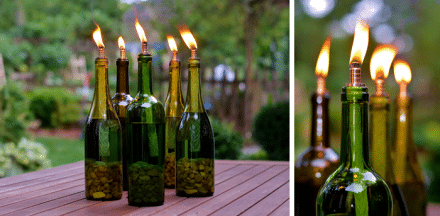 Tiki torches are super useful when it comes to keeping bugs and flies at bay. Old wine bottles are super practical for making tiki torches at home. To make the solution, mix isopropyl alcohol with distilled water and pour it into the bottle.