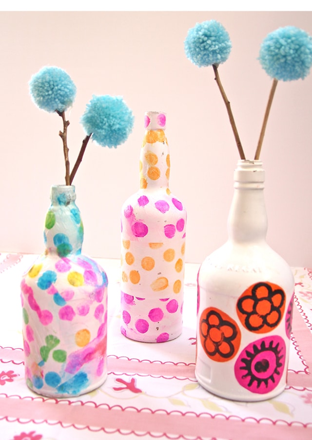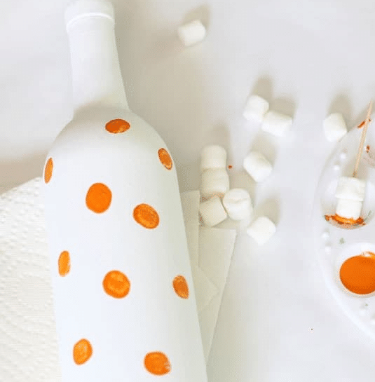 An easy way to paint your bottles is by dipping cotton balls or pom-poms in paint and pressing them on the surface of the bottles.