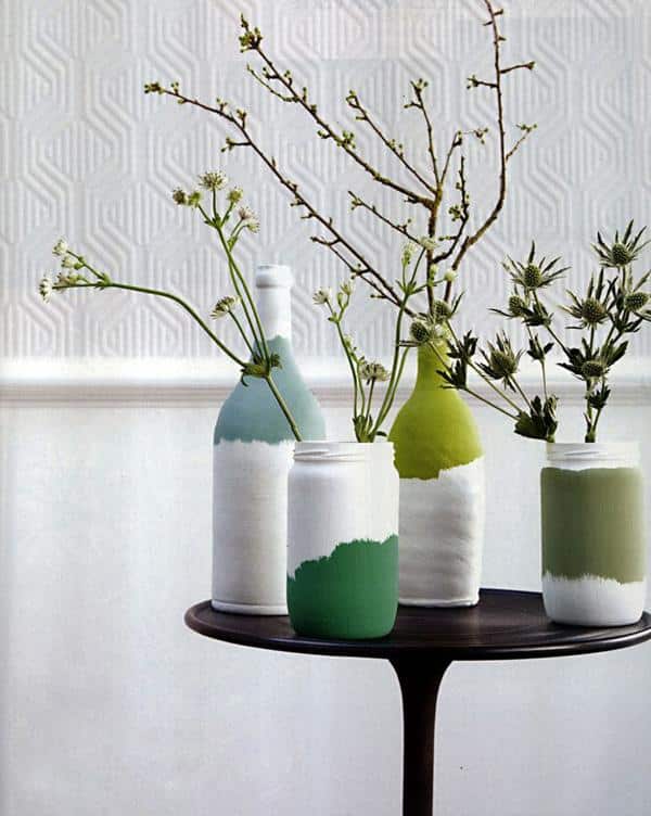 Wine bottles covered with pastel shades like green, pink, yellow, and blue make for excellent vases and can add a pop of color to your room if placed against cream or off-white walls.