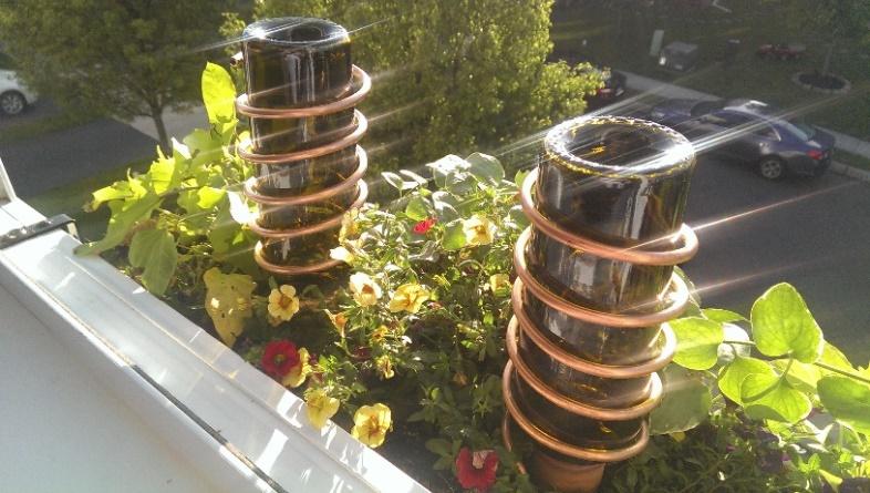 Convert and upcycle your old wine bottles into citronella candles in a matter of 10 minutes. Start by applying hot gluefrom the top of the bottle and attach a washer over the opening. Fill the bottle with torch fuel, slip a copper coupling with the larger end facing upwards, and twist the wick down into the bottle. Your citronella candle is easy.