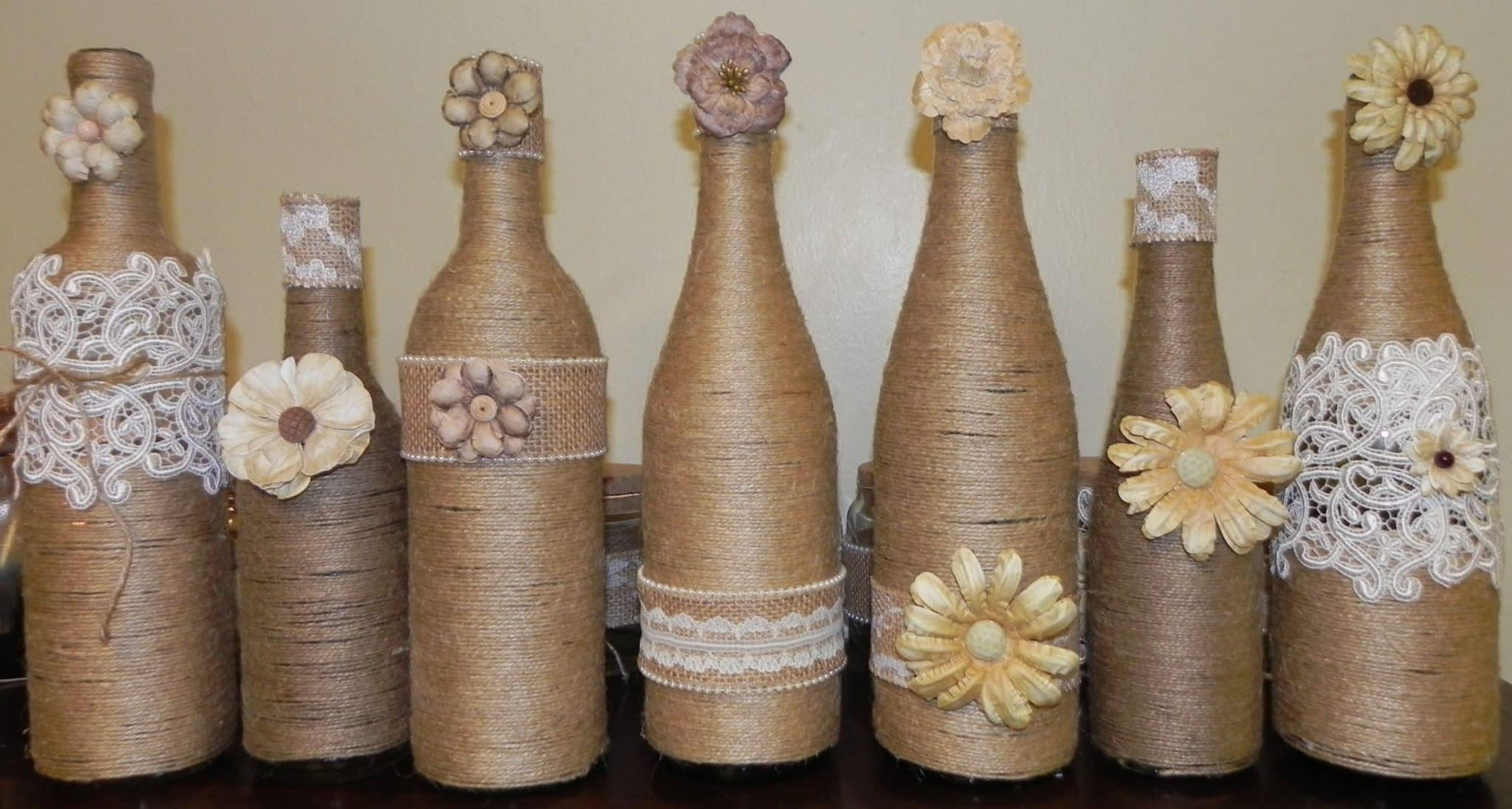 Twine wrapped around bottles can give your space an overall rustic outlook. It is also a smart way to cover any chips or scratches on the bottles so that you can convert them into vases.