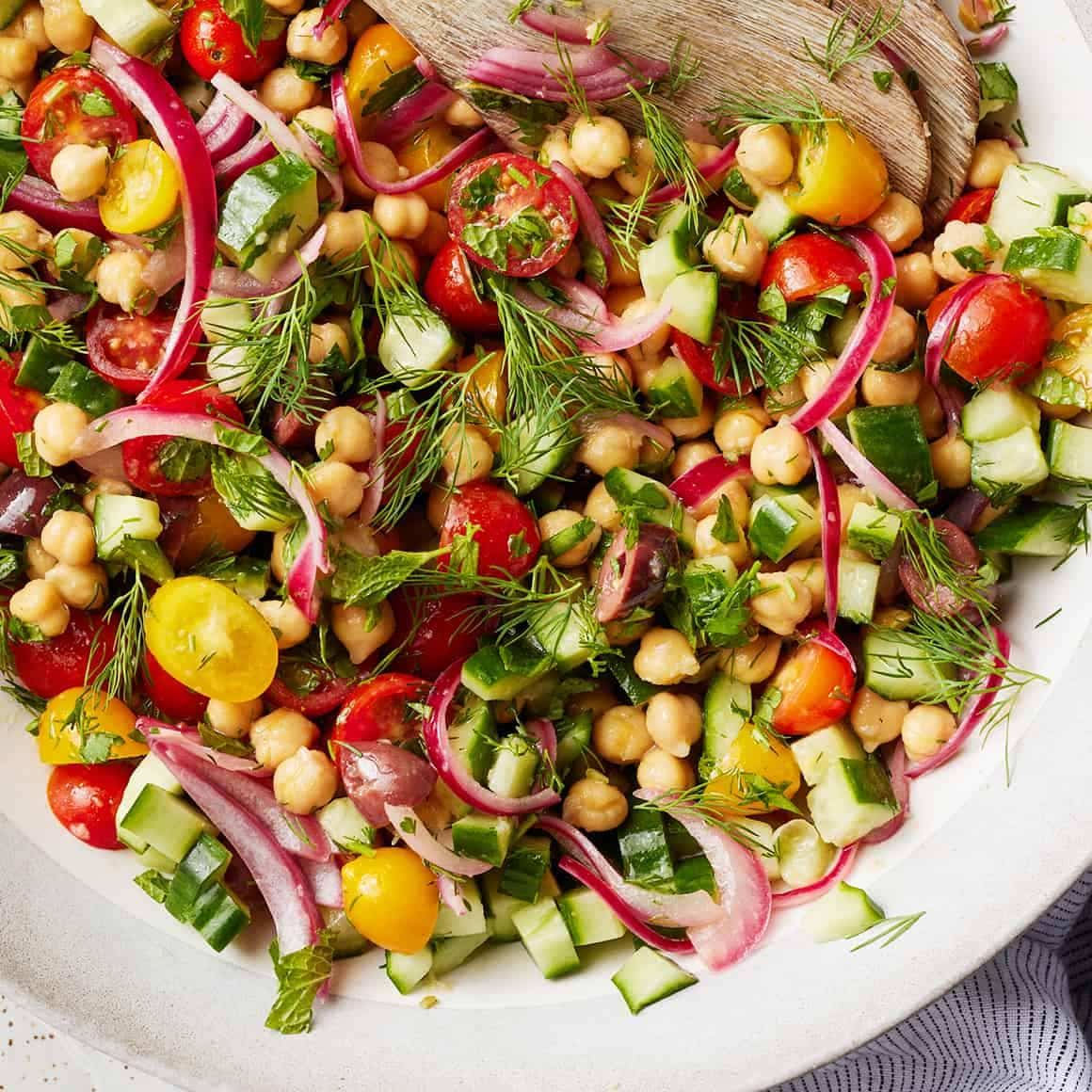 Chickpea salad, made with tender chickpeas, fresh vegetables, and a tangy dressing, is a nutritious and flavorful side dish that pairs well with Greek lamb.