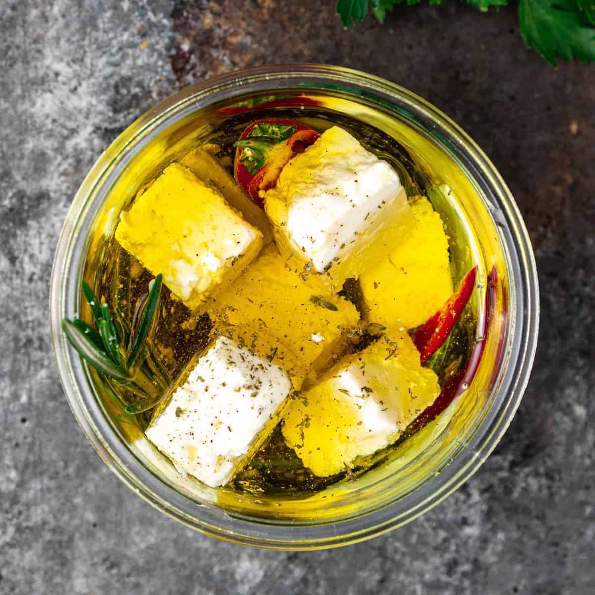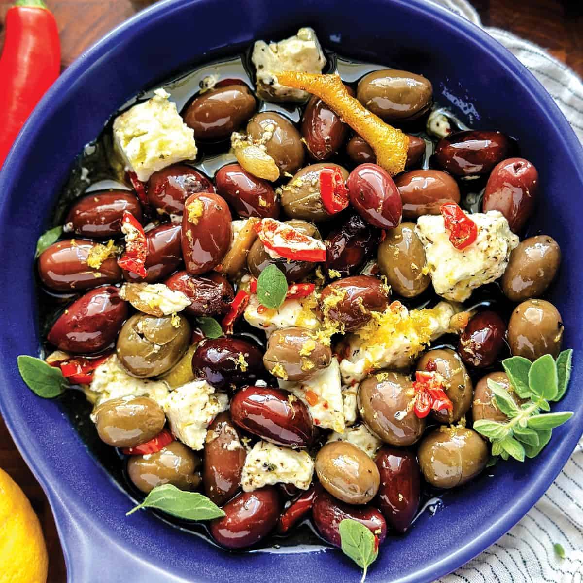 Olives and marinated feta, a classic Mediterranean combination, make for a simple and flavorful side dish that complements Greek lamb.