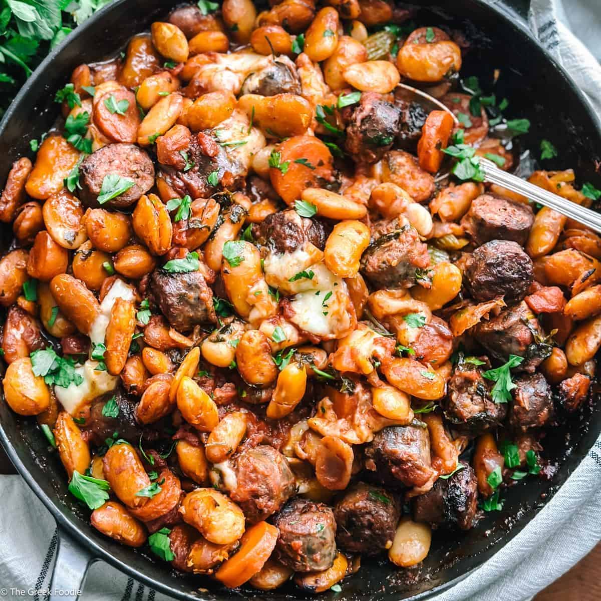 Gigantes plaki, or baked giant beans, is a hearty and flavorful side dish that pairs wonderfully with Greek lamb.