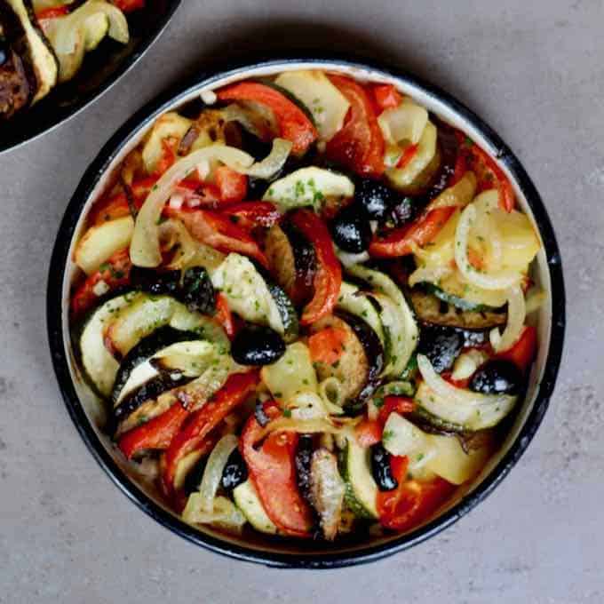 Greek-style ratatouille, or briam, is a hearty and flavorful vegetable dish made with a variety of seasonal vegetables, baked with olive oil and herbs.