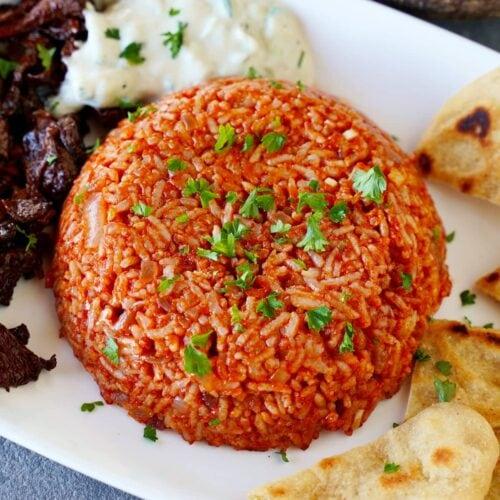 Greek tomato rice, or ntomatorizo, is a flavorful and aromatic rice dish that pairs beautifully with Greek lamb.