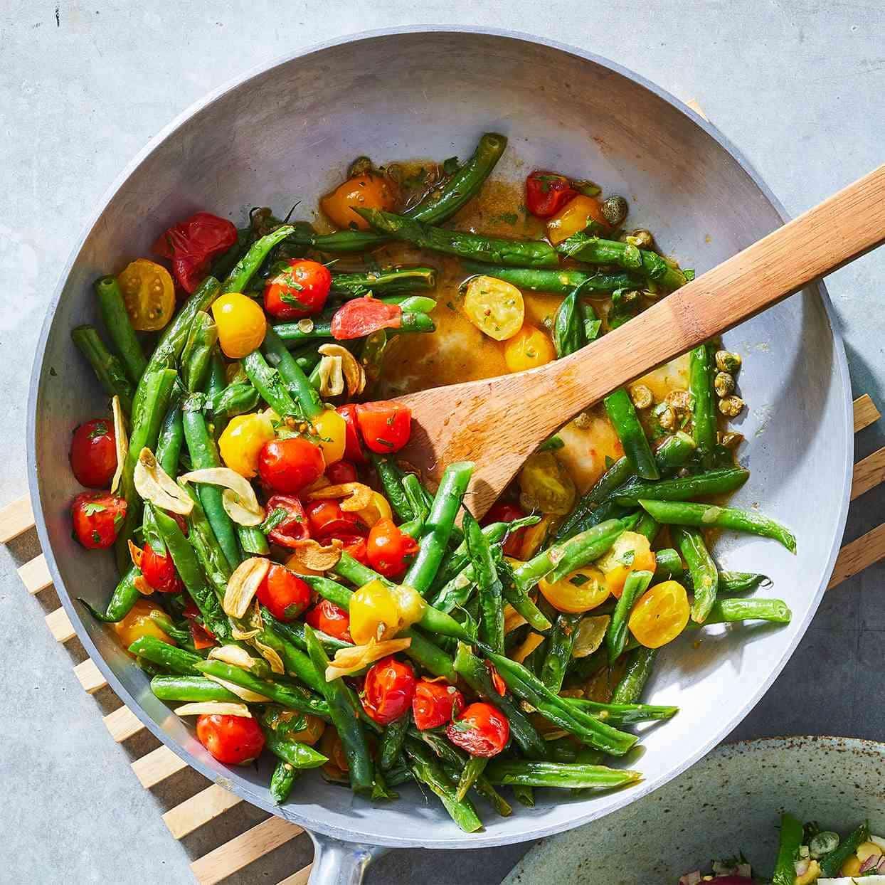 Green beans with tomatoes and garlic are a simple yet flavorful side dish that is a great match for Greek lamb.