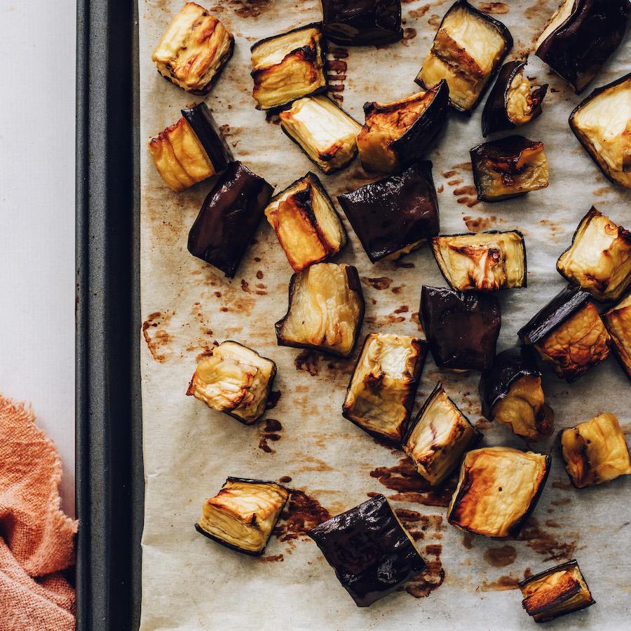 Roasted eggplant also provides a smooth, velvety texture that contrasts nicely with the lamb.