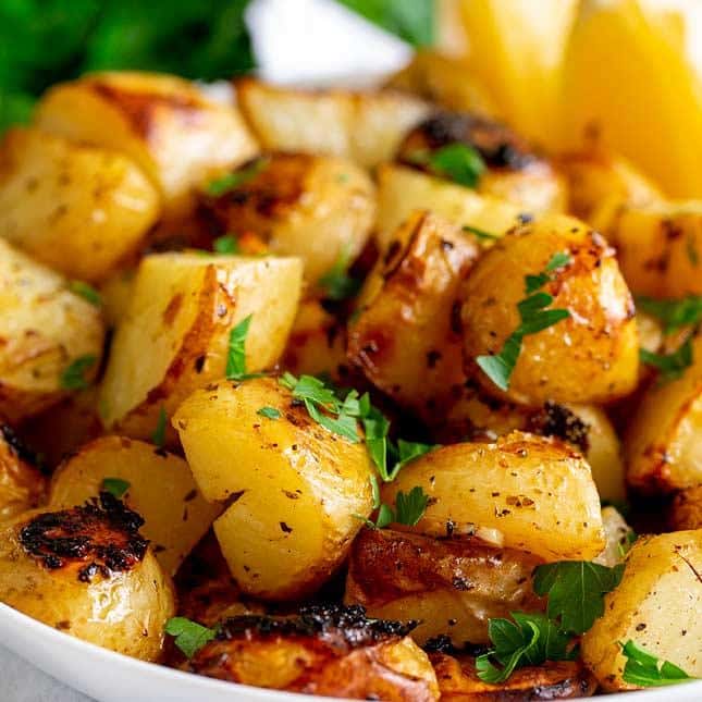 Roasted lemon potatoes are a traditional Greek side dish with a crisp exterior and tender, flavorful interior.