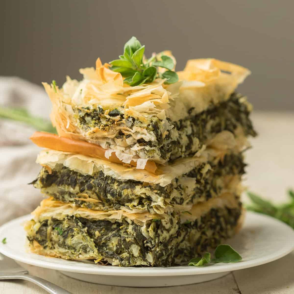 Spanakopita, a savory pie filled with spinach, feta cheese, and herbs wrapped in flaky phyllo pastry, is a delicious side dish for Greek lamb.