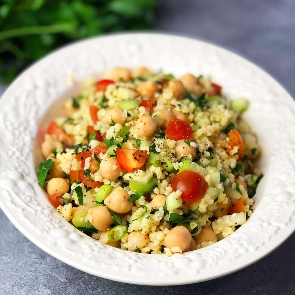Tabouli is a light and refreshing salad made from bulgur wheat, parsley, mint, tomatoes, and lemon juice.