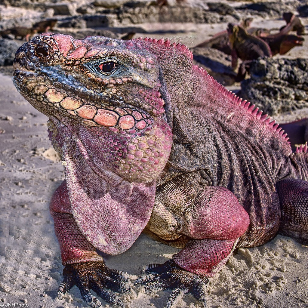 The Bahamas Rock Iguana is native to the Bahamas islands and is known for its distinctive coloration, including red, orange, and gray shades.