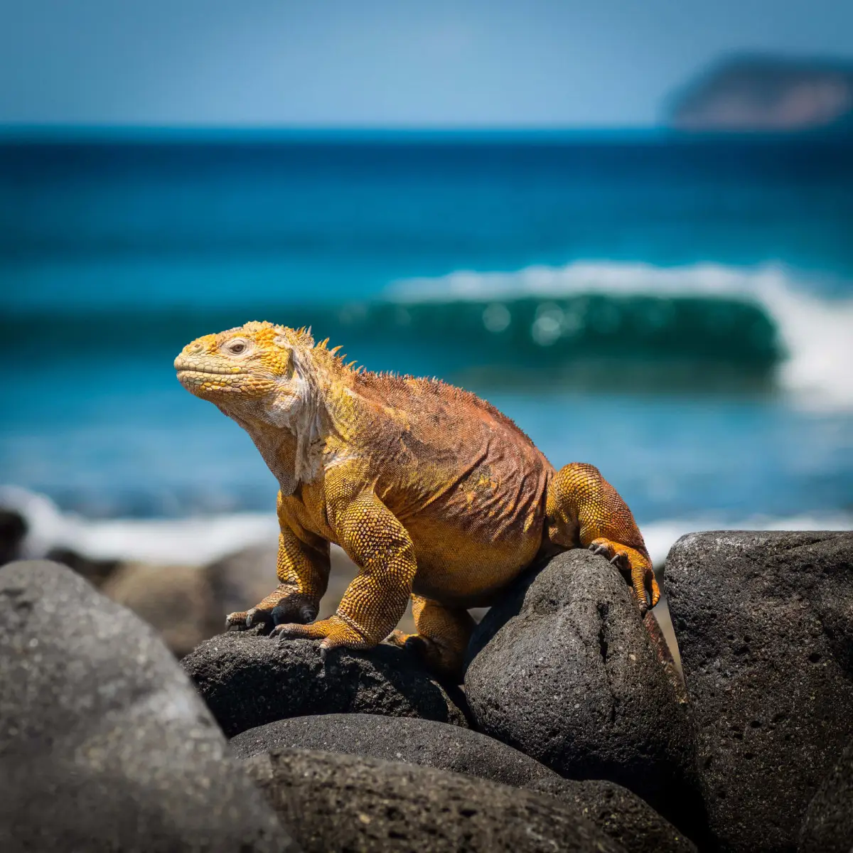 The Galápagos Land Iguana is native to the Galápagos Islands and is known for its yellowish coloration and robust build.