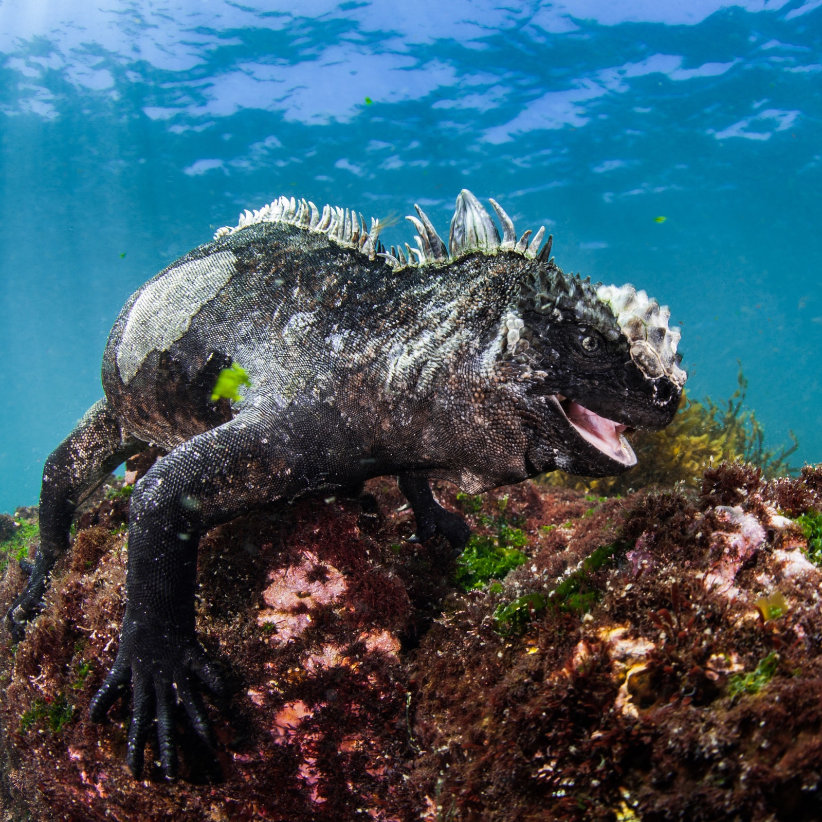 The Marine Iguana is unique among iguanas for its ability to forage in the ocean.