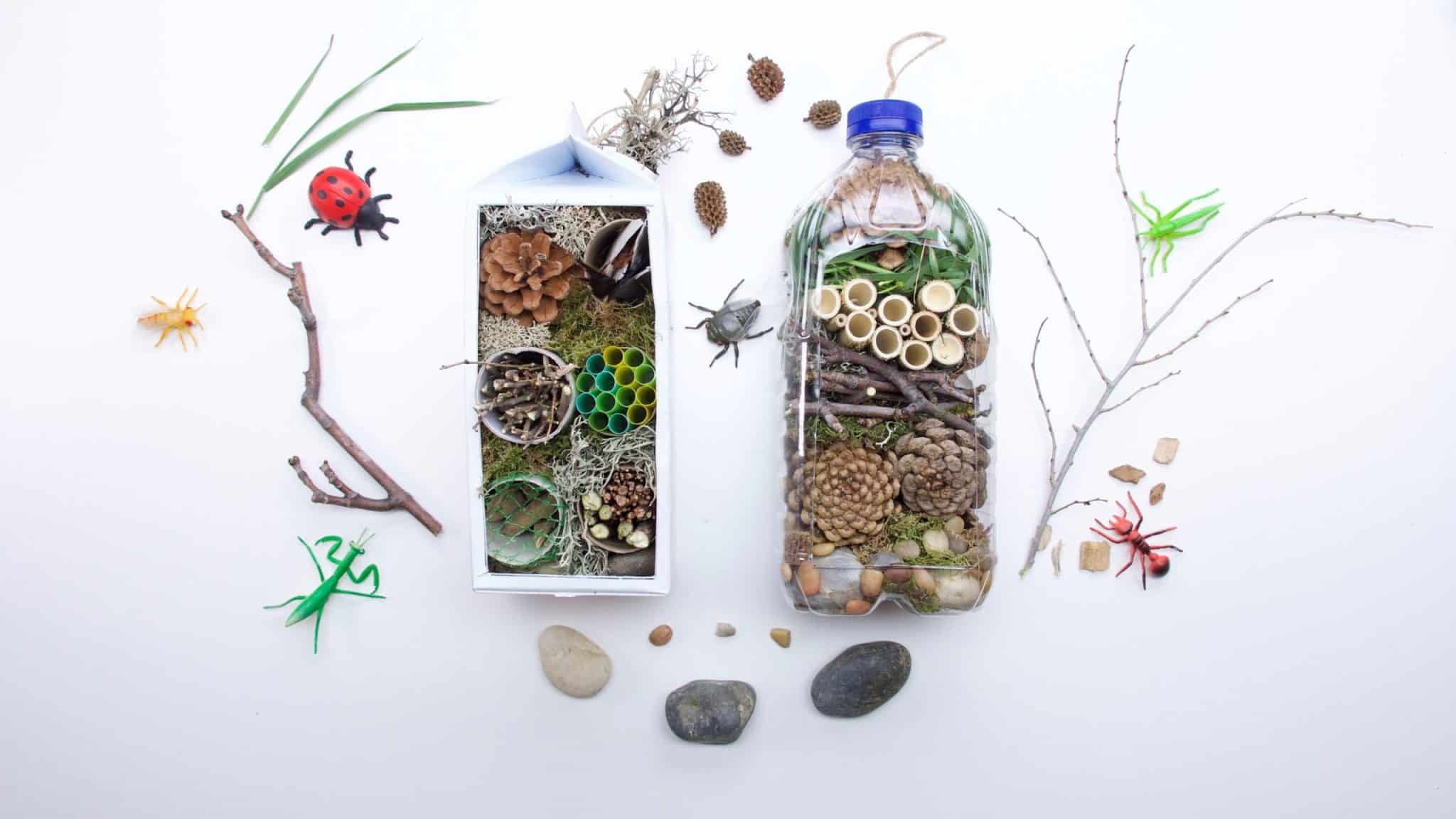 To make an inexpensive bug box, collect as much waste from home as possible. Upcycle plastic pipes, plant pots, withered leaves, branches, hollow bamboo canes, and so on to attract bugs, insects, and birds.