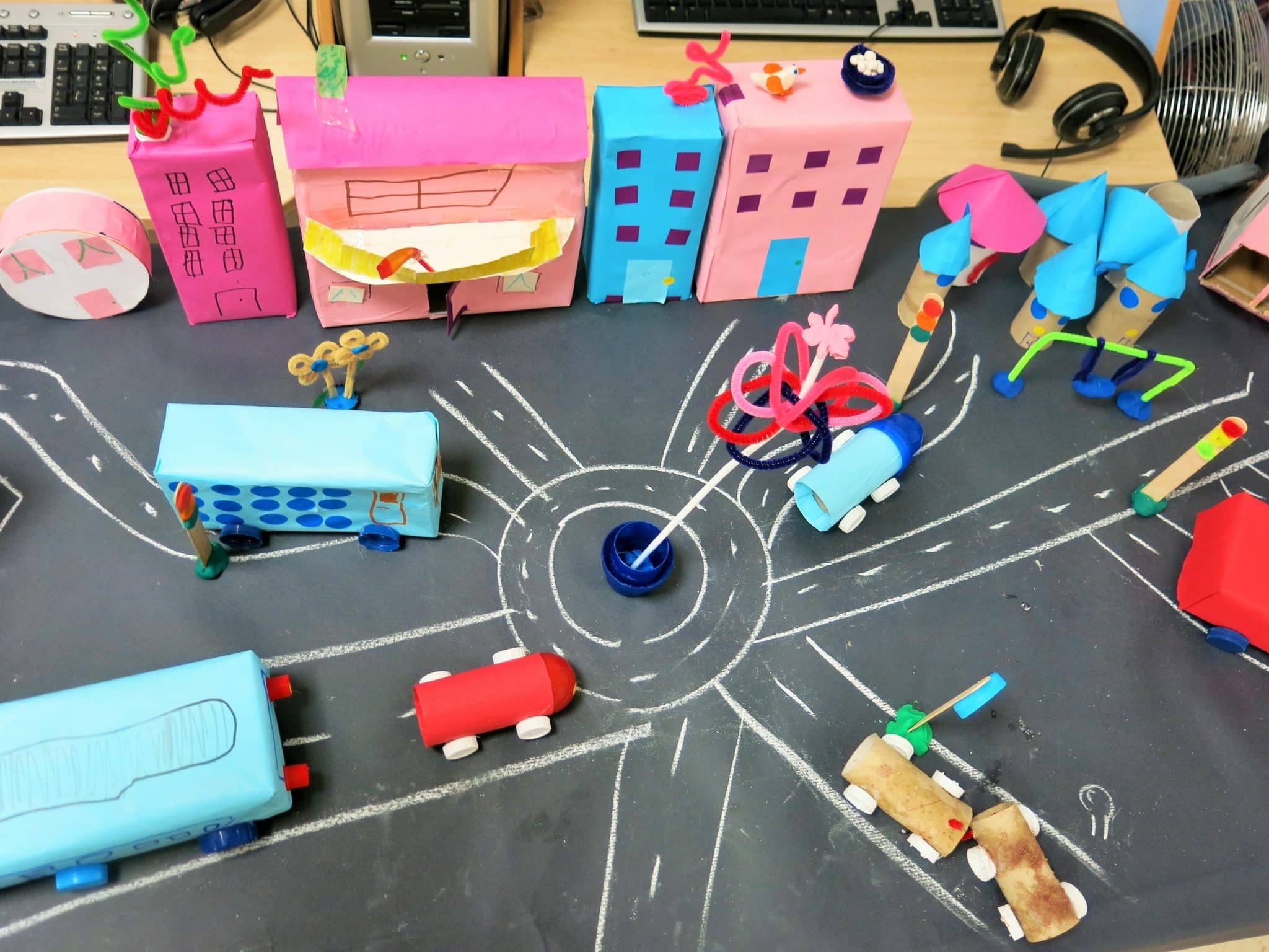 Round cardboard found in toilet paper, egg cartons, old cardboard boxes, unused wooden planks, and old plastic toys like cars, Legos and figures, eggshells, etc., can be used to make the model of a city.