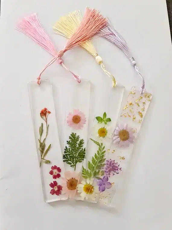 Once the flower has dried, sandwich it between two adhesive plastic sheets to make a bookmark, greeting cards, or wall hangings. You can even make coasters or name tags using these pressed flowers.