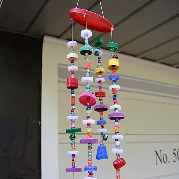 To make a wind chime, you can ask your child to collect old steel pipes, bamboo sticks, save steel caps from soft drink bottles, and a glass jar or bottles. Turn the bottle upside down, make a small hole in the cap for the string to pass through the hole, and hang it upside down on your balcony.