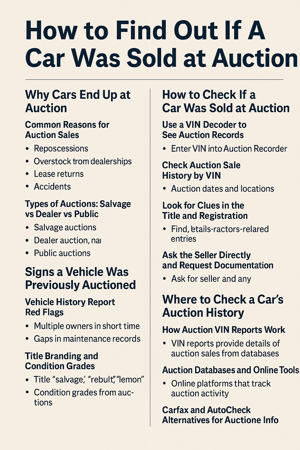 How to Find Out If a Car Was Sold at Auction? Thousands of vehicles are sold every day through auto auctions across the country. While auctions provide opportunities to buy used cars at attractive prices, they also raise concerns.