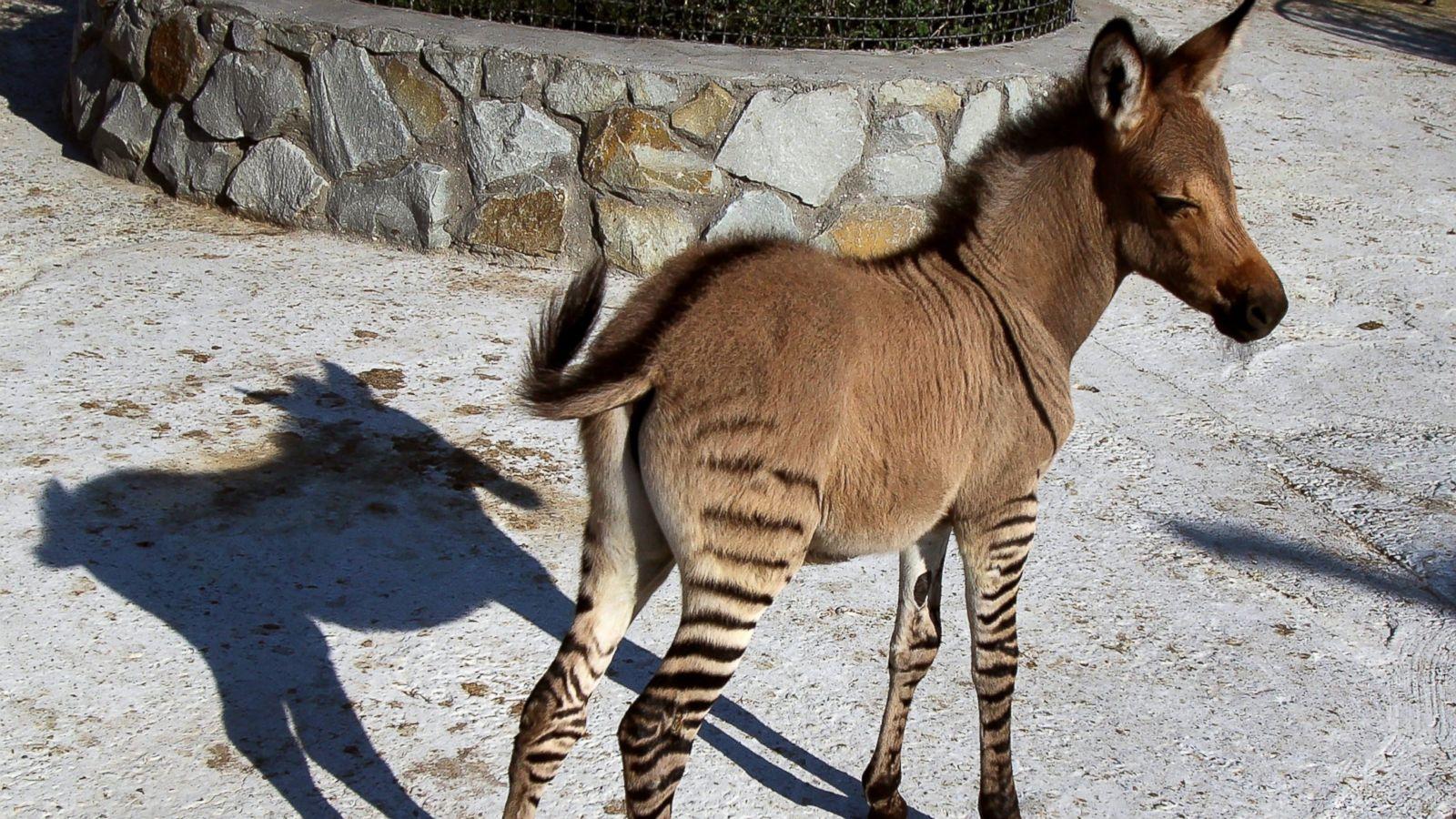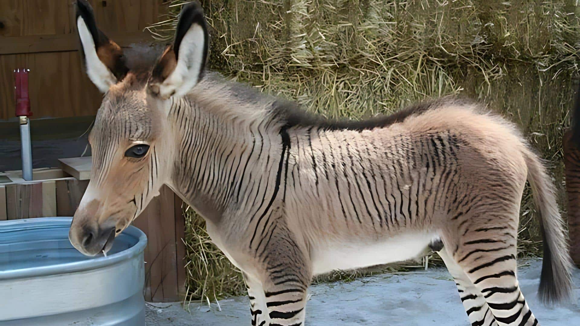 A zonkey is a hybrid of a zebra and a donkey, inheriting traits from both parents. It has striped legs but often a solid-colored body.