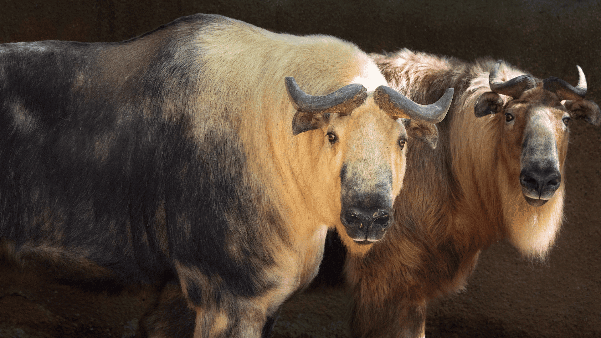The Takin is a large, muscular goat-antelope with a shaggy golden-yellow to brown coat and a prominent Roman nose. Males can weigh up to 770 pounds and are adapted to rugged mountain terrain.