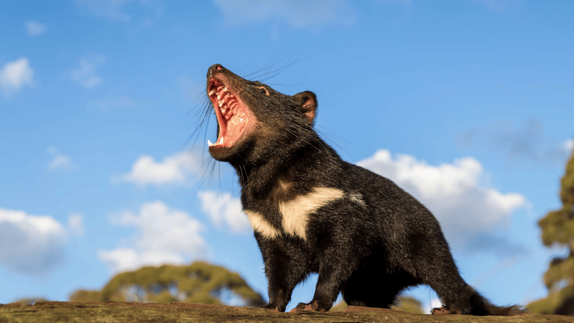 This stocky, muscular marsupial has black fur, sharp teeth, and a wide mouth. It is roughly the size of a small dog.