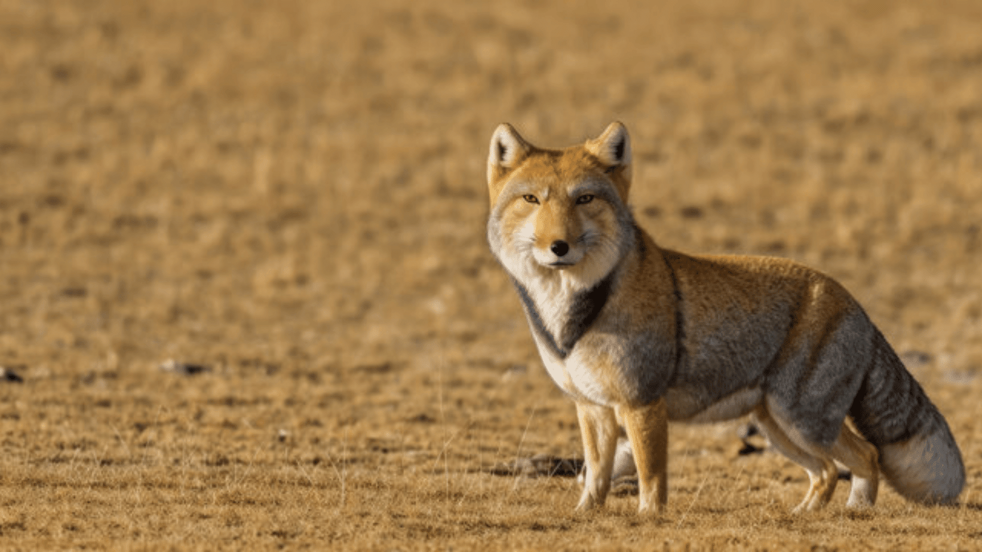 The Tibetan Fox is a small to medium-sized canid with a distinctive square-shaped head, narrow eyes, and a thick, bushy tail. Its coat is tan to gray with pale underparts, helping it blend into the grassy plateaus of its native range.