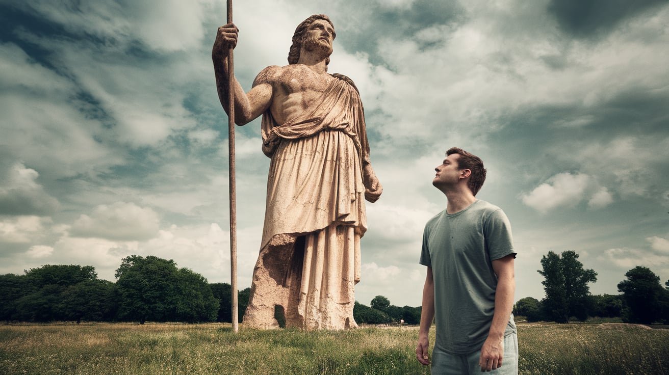- An individual feeling overwhelmed and dizzy when standing next to a large statue in a park