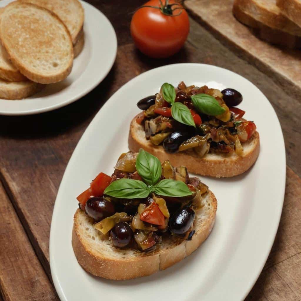 - Flavor Profile: Sweet and tangy eggplant-based relish with olives, capers, and vinegar, complemented by crispy crostini.