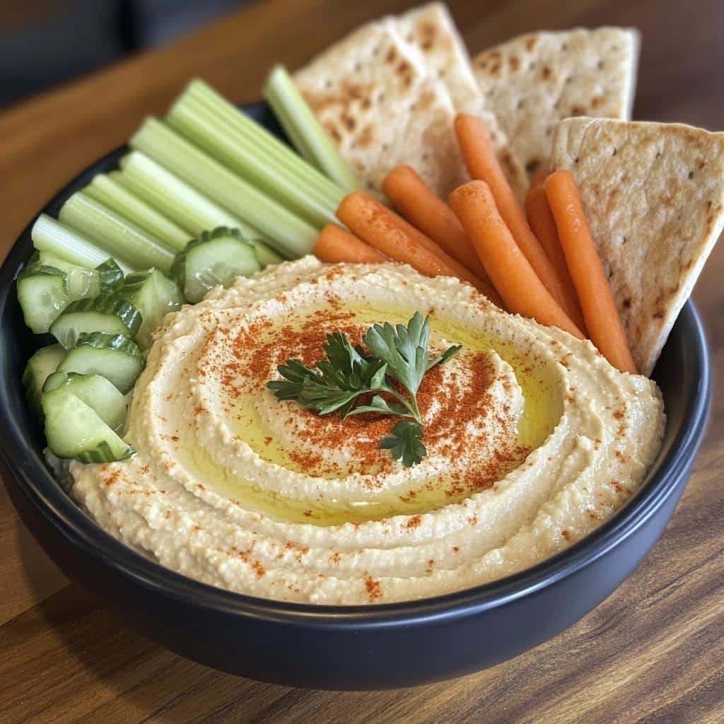 - Serving Tip: Serve the hummus in a bowl surrounded by sliced pita bread and raw veggies like carrots and cucumbers.