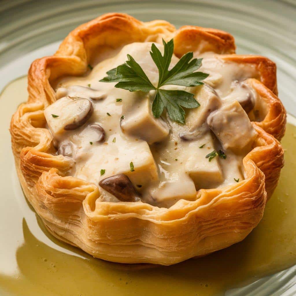 The puff pastry shell is light and flaky, providing a contrast to the smooth, creamy filling. The dish is traditionally served as an appetizer or a light main course and is beloved for its elegant presentation and comforting flavors.