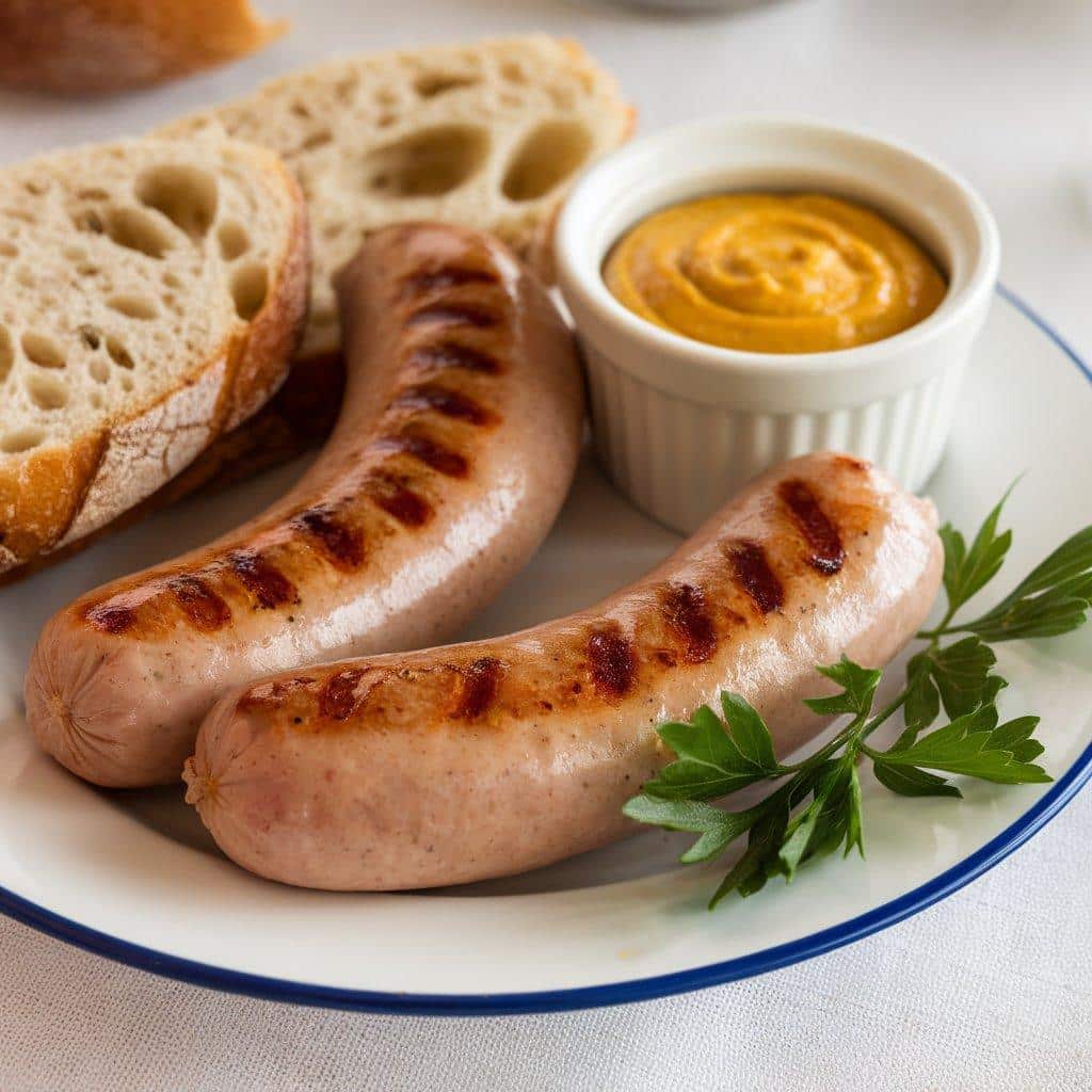 The sausages are typically seasoned with herbs, such as nutmeg, salt, and pepper, which enhance their subtle taste. The sausages are often served with mustard, which provides a sharp contrast to the richness of the meat.