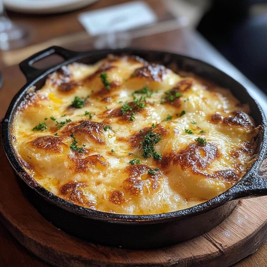The dish is traditionally seasoned with salt, pepper, and sometimes nutmeg, and finished with a layer of melted cheese, often Gruyère or Emmental. The result is a rich, velvety texture with a crispy, golden top.