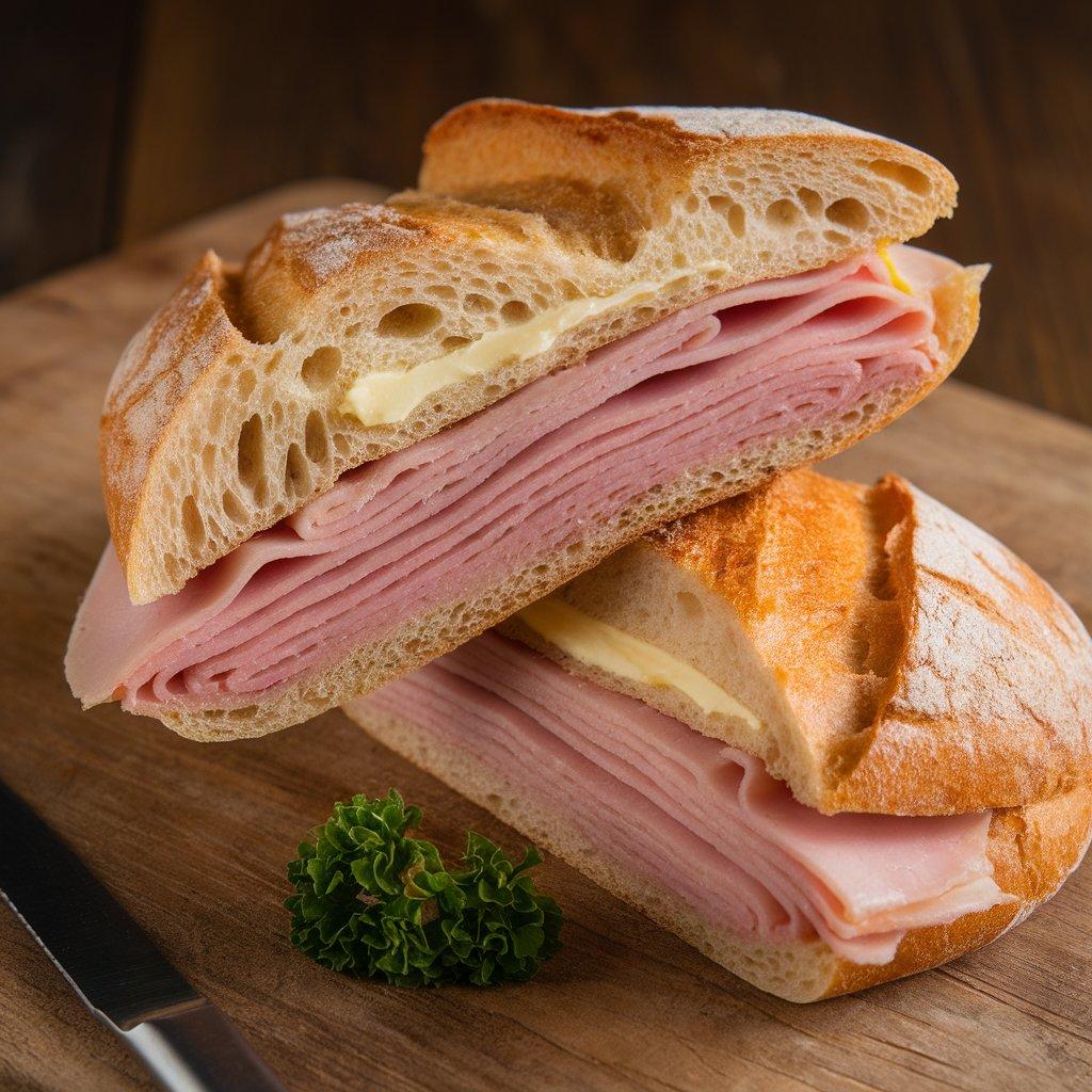 Jambon-beurre is a simple yet iconic French sandwich made with a freshly baked, crusty baguette filled with creamy unsalted butter and thinly sliced Jambon de Paris, a mild, cooked ham.