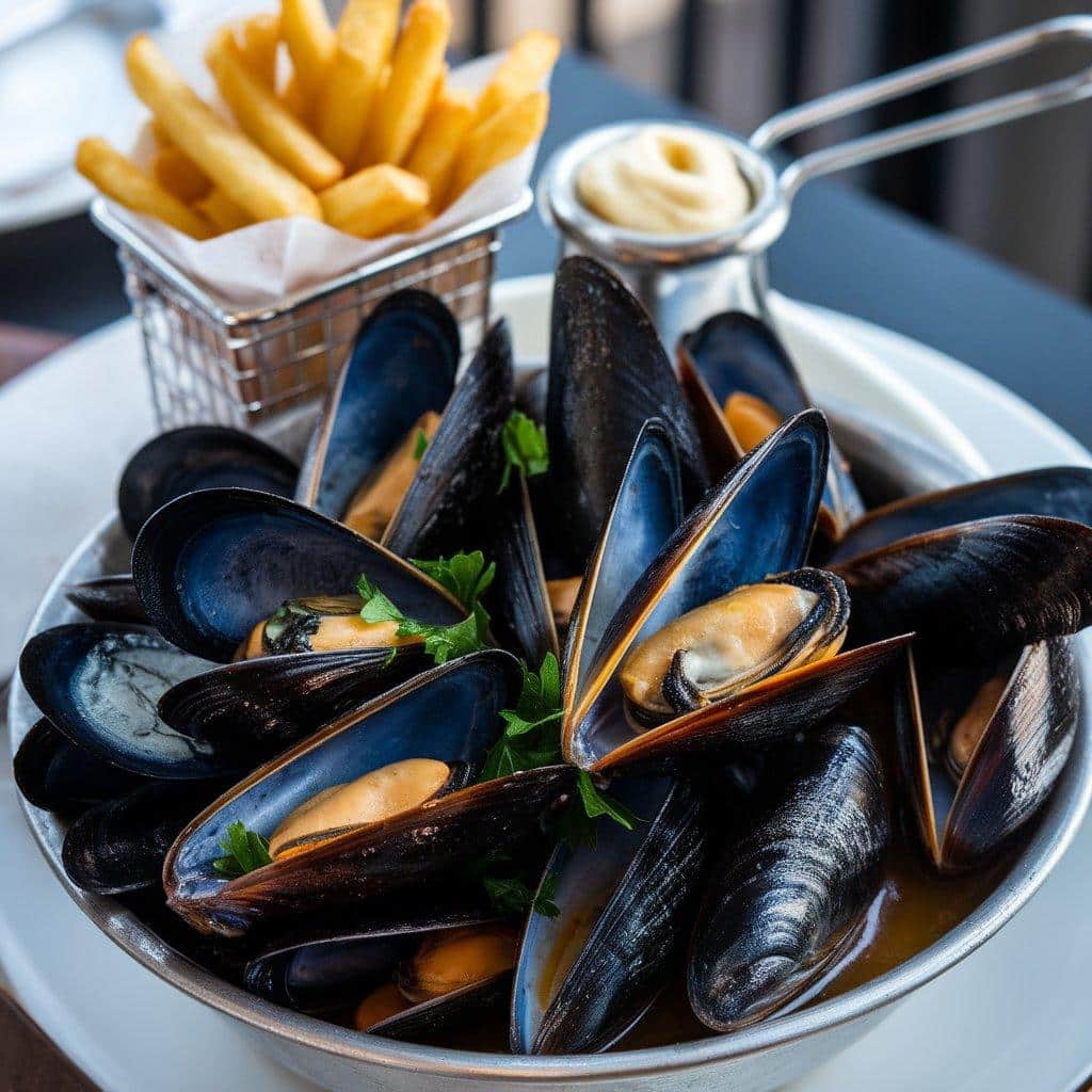 • Serving Style: Mussels are typically served in a large bowl or pot with fries on the side. The dish is often accompanied by a dipping sauce or aioli for the fries.