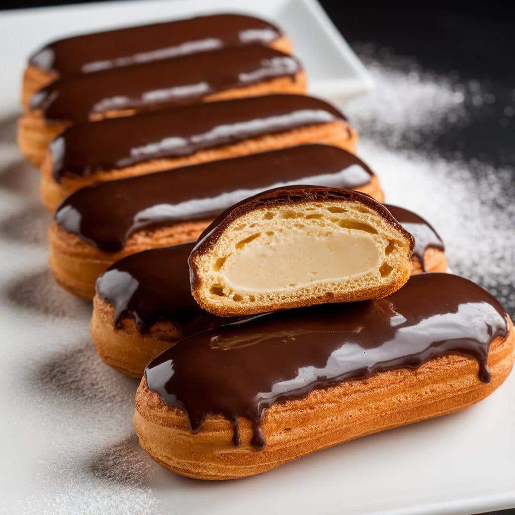 • Serving Style: Éclairs are typically served as individual pastries, often sliced in half to reveal the cream filling inside. They can be enjoyed as a snack or dessert.