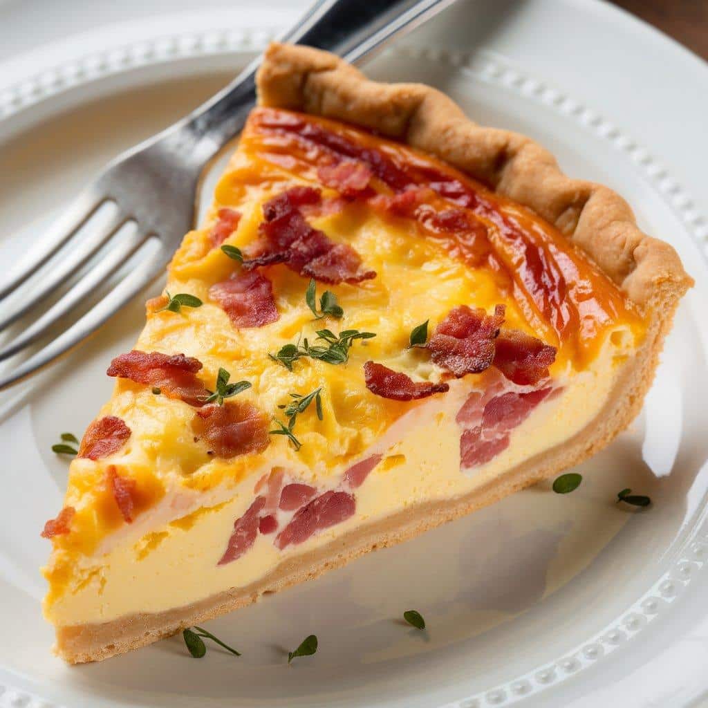 Quiche Lorraine is a savory tart with a buttery, flaky crust filled with a rich mixture of eggs, cream, cheese (often Gruyère or Emmental), and crispy bacon or lardons.
